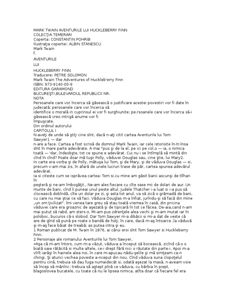 Mark Twain Aventurile Lui Huckleberry Finn Rezumat Va Rog Frumos Brainly Ro
