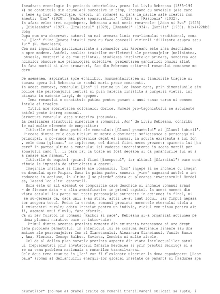 Ion De Liviu Rebreanu Rezumat Pe Capitole Docx Document